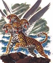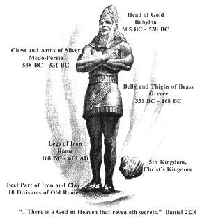 "Sea" or "Water" represents "peoples and multitudes and nations and tongues." Rev. 17:15 (compare Isa. 8:7).In chapter 7 of Daniel the prophet sees the coming world empires represented as beasts. A parallel description we find in Dan. 2:27-45 (see illustration above/right) where individual parts of a statue are symbolizing, in an accurate manner, the future course mankind will take.